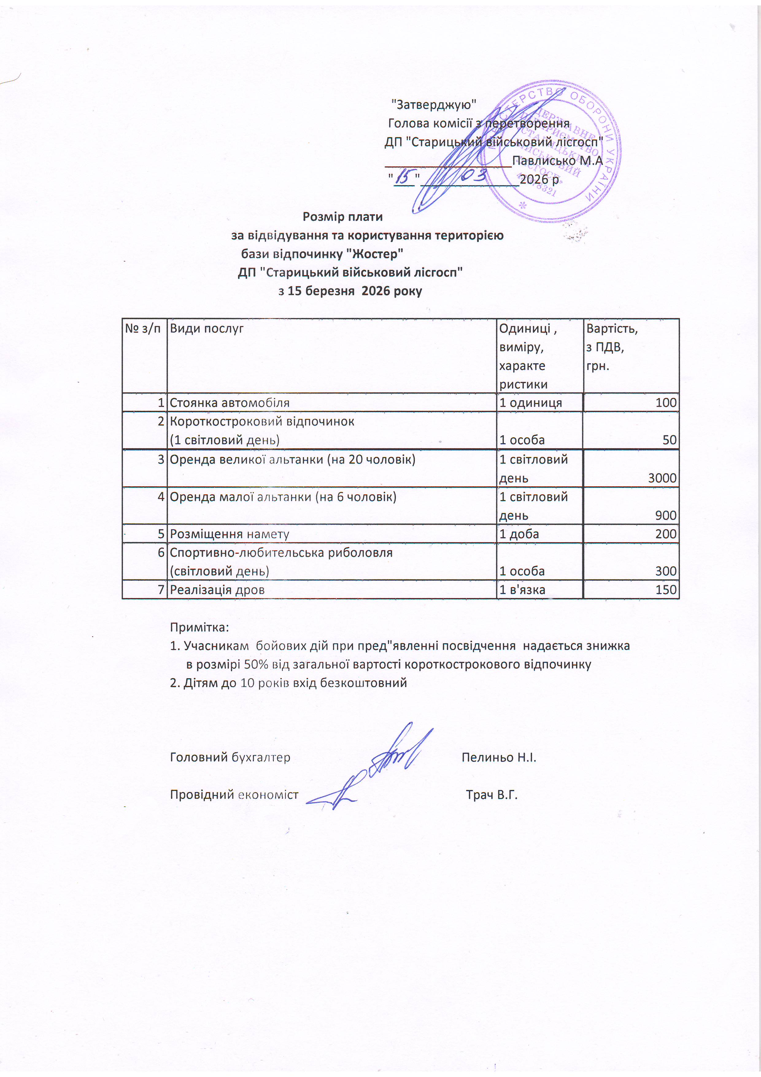 Ціни на послуги відпочинку від 15 березня 2026 року